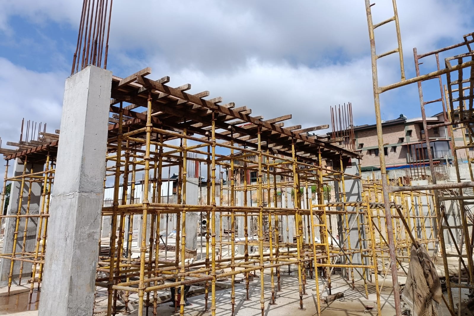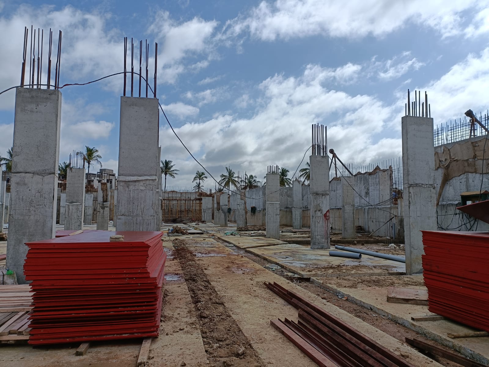 The basement flooring concreting is currently underway, and the casting of columns is also nearing completion.