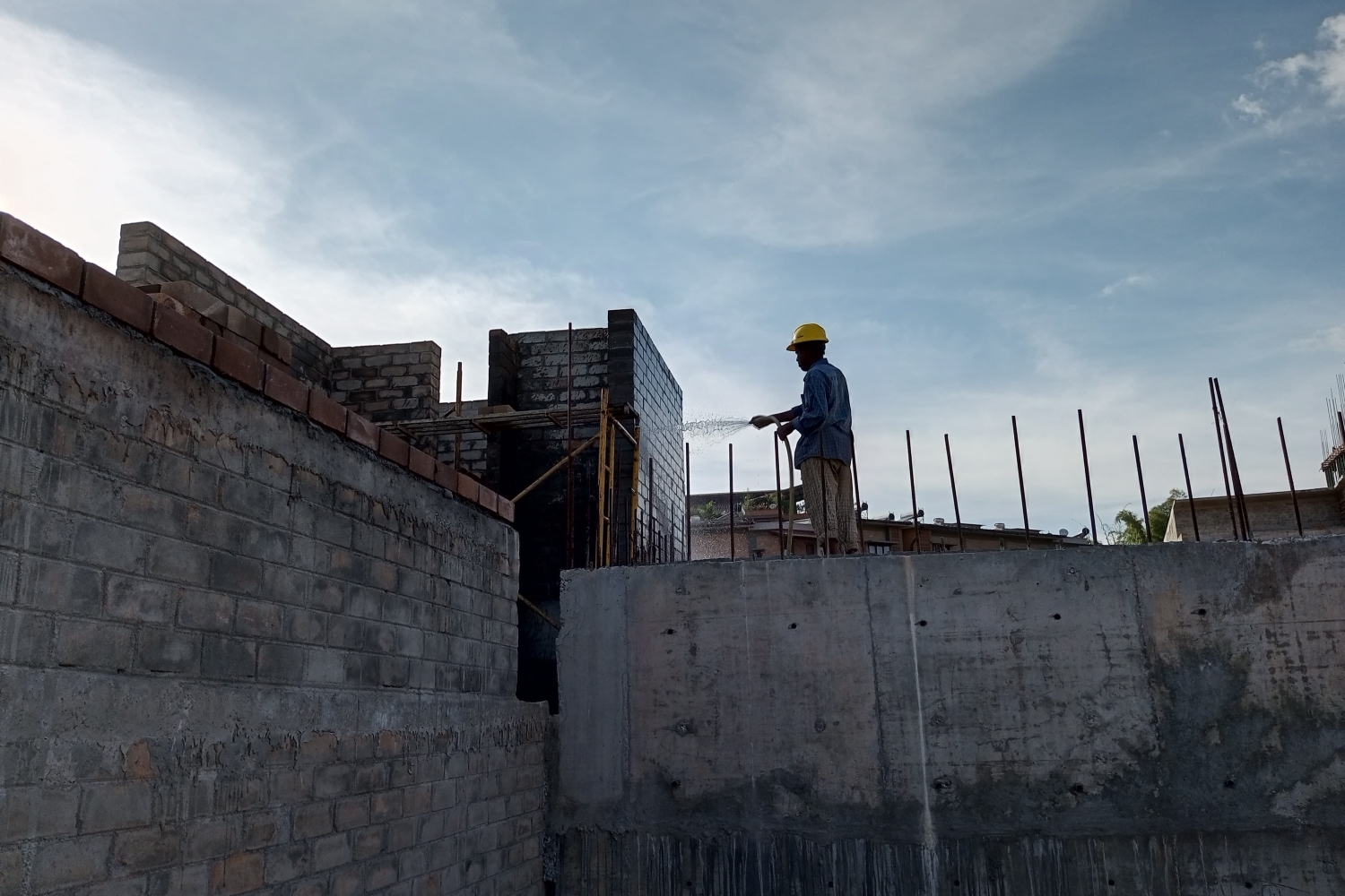 While the slab casting for the first house is complete, the team is now focused on continuing the block work for the other houses