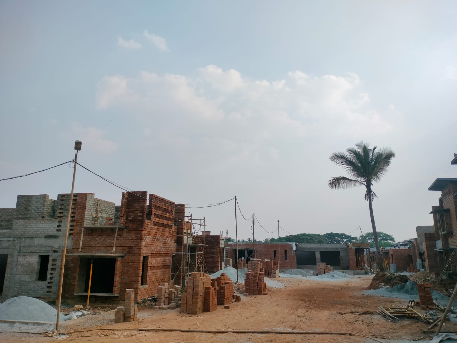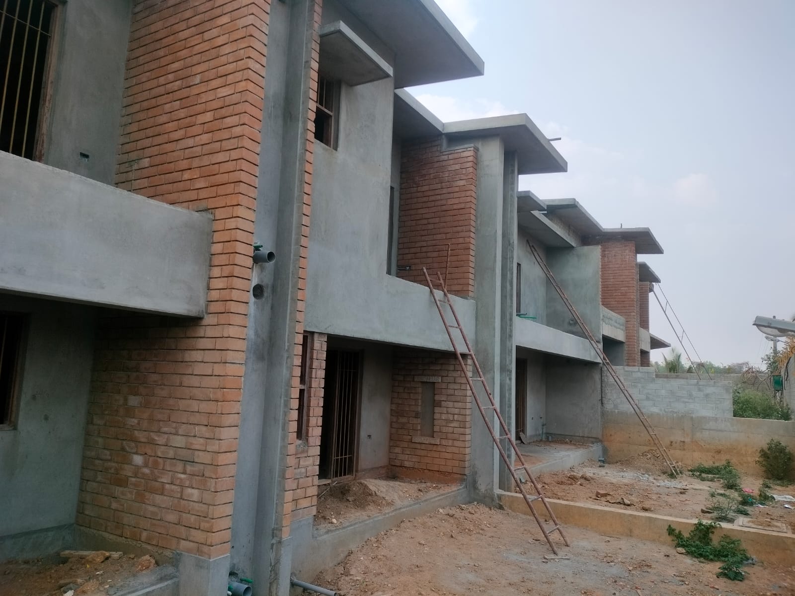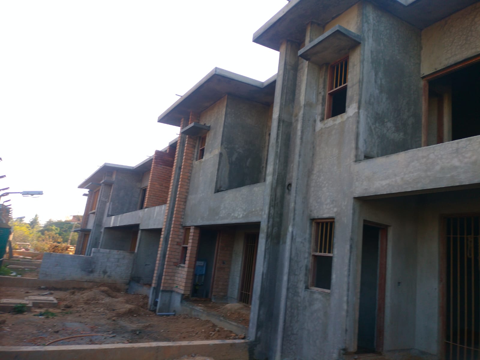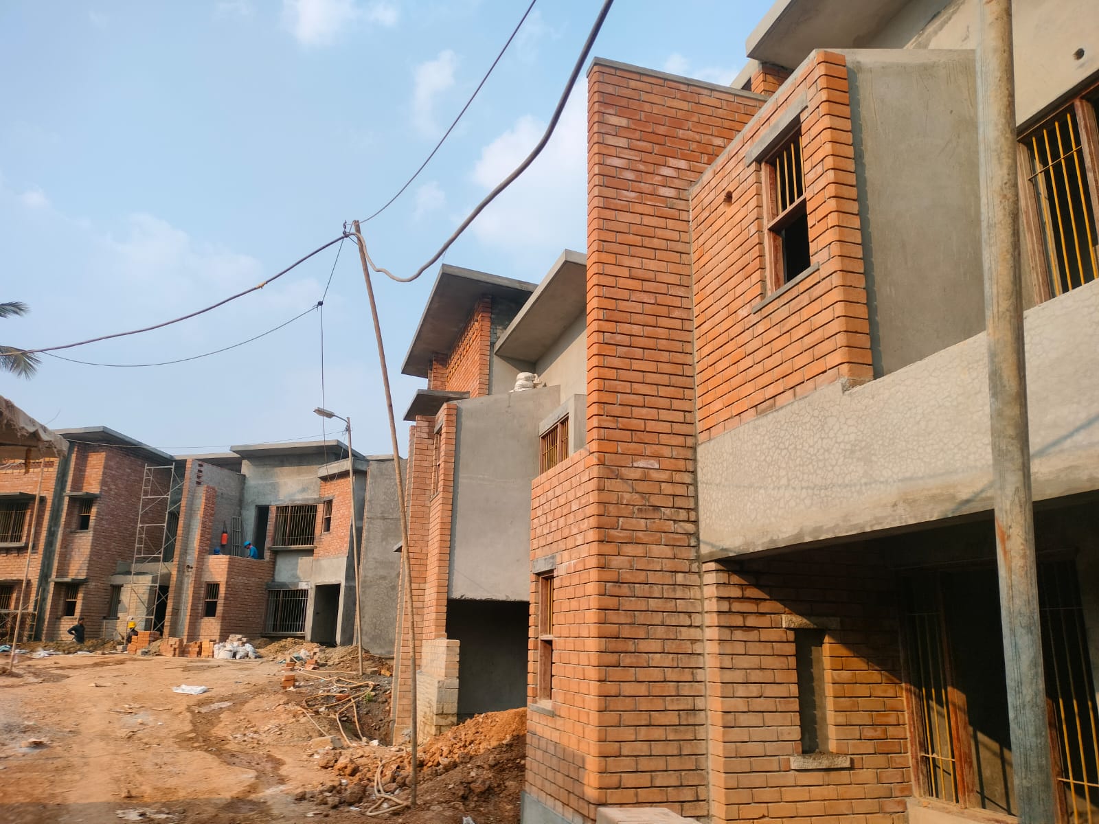 The houses on the northern side are rapidly progressing with leveling slab edges, internal and external plastering, electrical and plumbing work, as well as frame fixing.