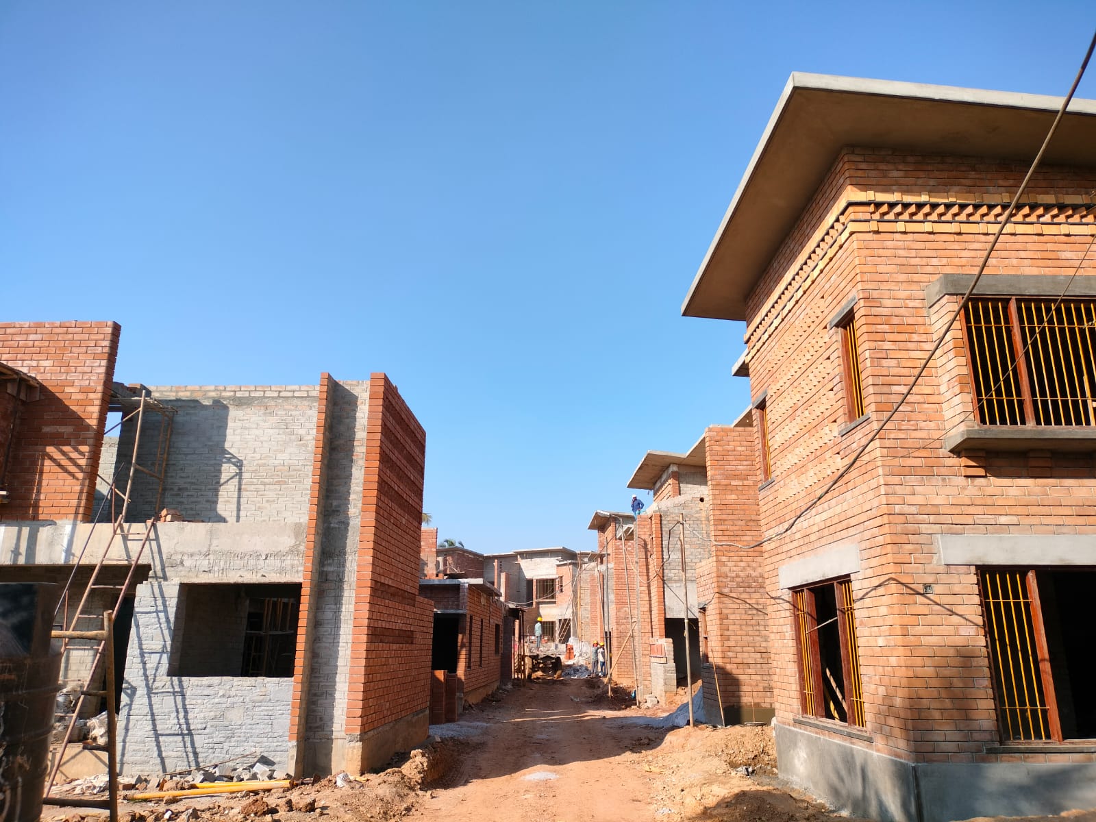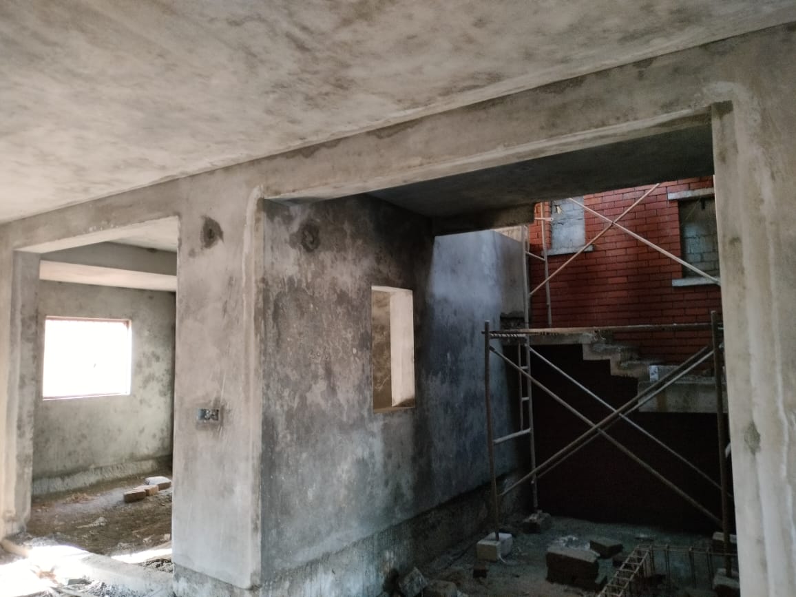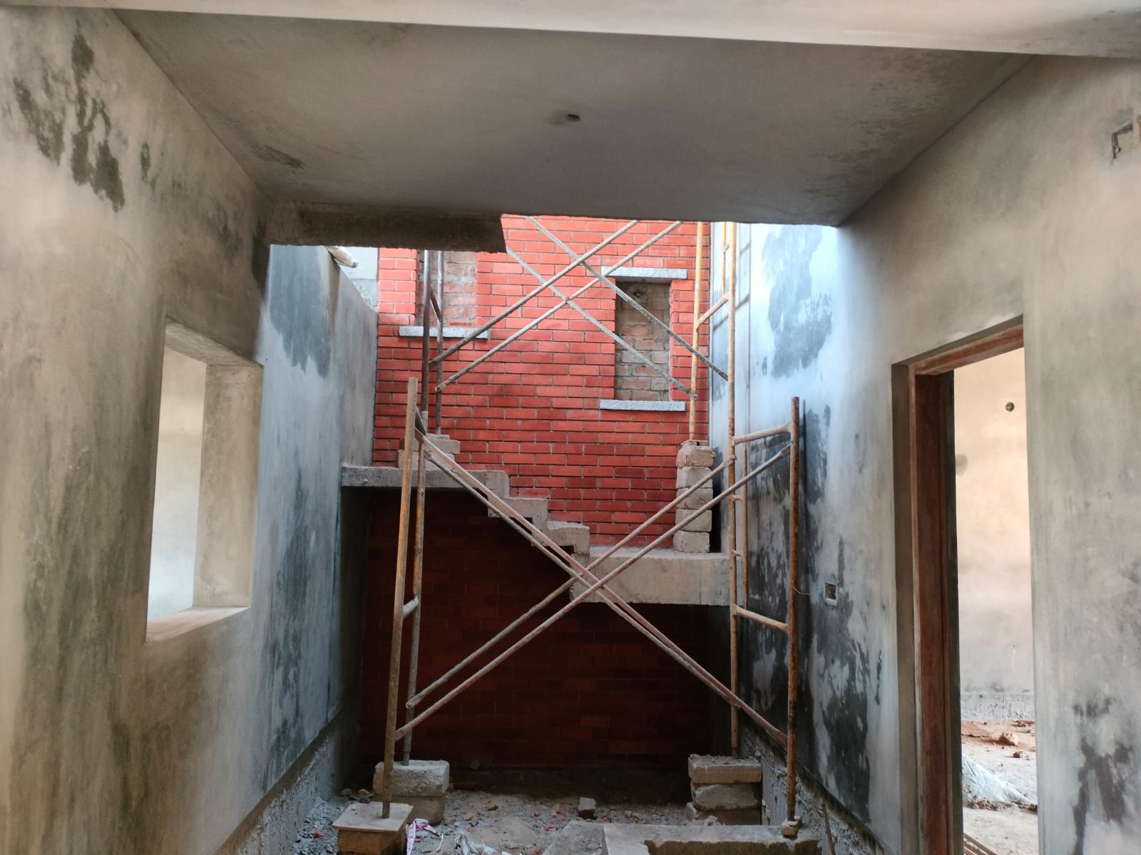 Progress is underway on the houses located on the northern side, involving internal plastering, first-floor slab installation, electrical and plumbing work, as well as frame fixing.